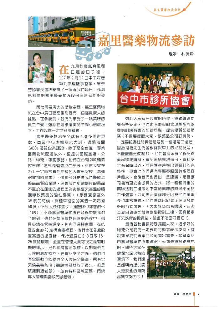 2019年01月號台中市診所協會會訊報導:嘉里醫藥物流參訪